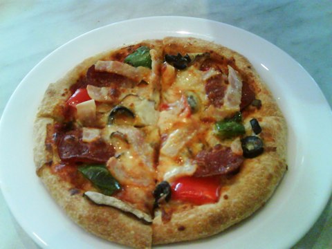 So we only ordered 2 things: Italian Deluxe 7″ Thin Crust Pizza @ RM 11.90 and Iced Mocha @ RM 7.90. The Iced Mocha looks like the 3 layer tea that is kinda popular in restaurants right now 🙂