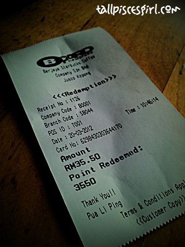 The process of redemption is very smooth and easy. I just need to hand them the card to pay for my stuff. The staff swiped my card and asked me to key in my pin number. After that, I was asked to sign on the receipt and voila, wait for my food to be ready!