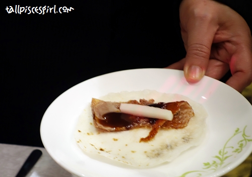 The thin Crispy Golden Skin is perfect with the right amount of meat. To make a Crispy Golden Peking Duck Skin wrap, take the skin and meat, add some scallion and their specially prepared hoisin (seafood) sauce and wrap it in the home-made thin pancakes called Momo.