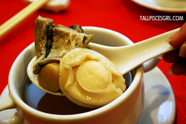 The dish that kick start our food review session is none other than Salmon and Snow Pear Lou Sang (RM 98++). Sweet and juicy salmon coupled with crunchy snow pear just gave the traditional lou sang a twist of freshness. Other alternatives include Homemade Vegetarian Loh Sang, Abalone Loh Sang, Abalone and Salmon Loh Sang that ranges from RM 88++ to RM 238++.