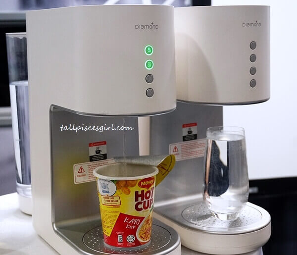 DIAMOND CORAL WaterBar has a smart dispenser design. Its dispenser area is 8-inches height, 7-inch width to cater for different sizes of containers. It is convenient to get hot water for various usages including making tea, soup, noodles and washing fruits.DIAMOND CORAL WaterBar – It can dispense 90℃ hot water that is perfect for making cup noodle DIAMOND CORAL WaterBar can dispense 50℃ warm water, 90℃ hot water with child lock activated, and room temperature water.