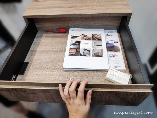 What I love most about King Slide SIMLEAD Metal & Wood Drawer System is the smooth and consistent movement of the drawer. Unlike the usual drawers, this one makes minimal sound (almost none) and it wouldn’t bounce back. Another plus point is, it gives a very durable and high quality vibe so I don’t need to worry about it breaking down on me anytime. King Slide has 124 patents worldwide for their drawer system.